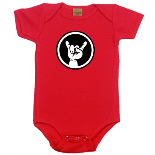 Baby Rocker Symbol on Infant One Piece, 6-12 mo, Red. ROCK ON!! Great rock and roll designer clothing modern baby kids. Laugh out loud fun. 100% baby rib cotton one piece by American Apparel. Made in the USA.