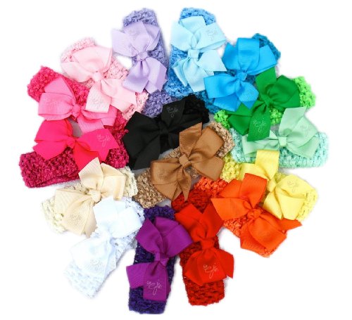 Ema Jane value! Set of 18 cute Ema Jane Grosgrain hair bows and 18 matching soft Ema Jane crochet headbands perfect for any color outfit. Mix and match colors, or use the bows with one of our Ema Jane Gerber daisy headbands.
