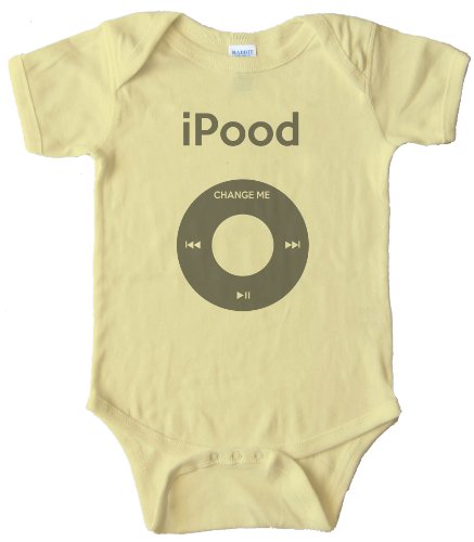 IPOOD - CHANGE ME - IPOD BABY ONESIE design silscreened onto a yellow RABBIT SKINS ONESIE . Printed on 5 OZ. 100% Ring-Spun Cotton and printed with water-based inks for ultra-softness. Three-snap bottom closure and Flatlock seams, Double-needle ribbed binding on neck, armholes, shoulders and bottom (white is sewn with 100% cotton thread).