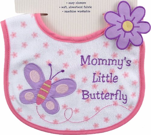 Luvable Friends applique side closure bib features a cute applique icon with embroidered sayings and matching trim. The bib has an extra large coverage area to protect baby's clothing from drool or messy spills. Easy closure. Available in several cute designs!