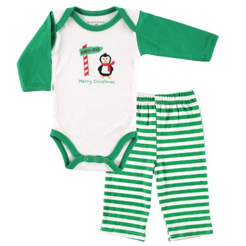 Luvable Friends layette collection of cute baby clothes and baby care products features 100% combed cotton interlock for the softest touch on your baby's gentle skin. These adorable Christmas bodysuit and pant sets are a great addition to your baby's holiday wear. The one-piece design makes for no fuss dressing, and snap closure makes diaper changing easier. Comes in 3 cute printed Christmas designs with matching pants in sizes up to 12 months: Merry Christmas, Santa's Little Helper, and Let it Snow.